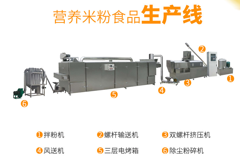 全自动化营养米粉生产线流程--原料粉碎--储料仓--自动称重系统--输送设备--拌粉机--螺旋上料机--膨化机--风送机 多功能烤箱--粉碎机组--粉碎膨化原料接收系统--多功能混合机--输送机--微波杀菌炉--原料接收仓--包装机系统